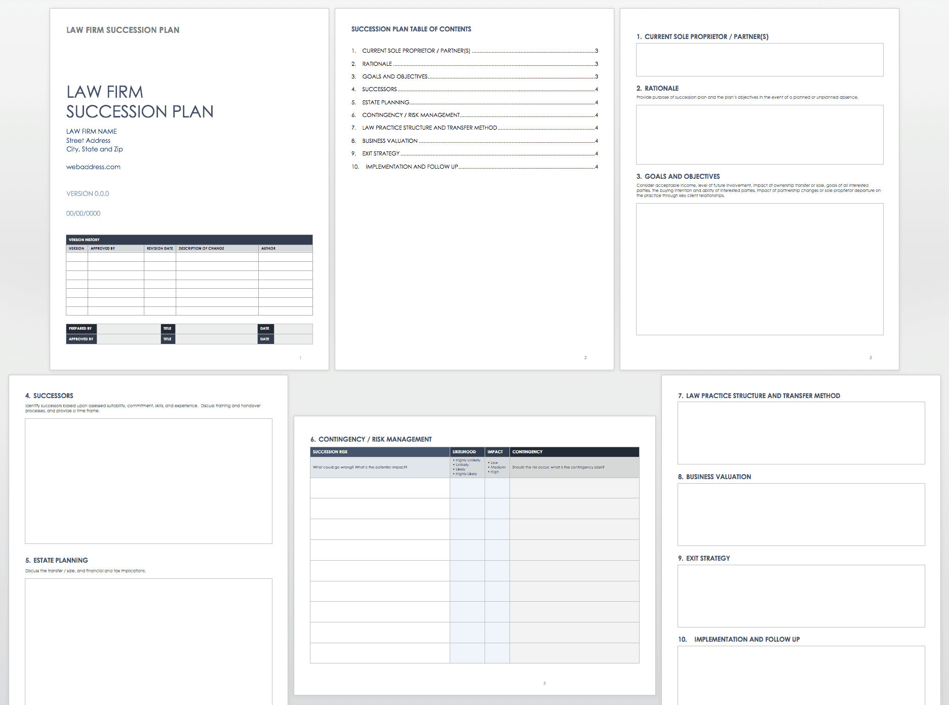 无论你是独资经营者还是律师事务所的合伙人,这个继任计划模板都为你提供了一个基本的大纲,帮助你制定与退休或转让所有权、确定有能力的继任者、制定实施继任计划的时间表等相关的具体目标。通过制定一个清晰的计划并定期回顾,为你的法律实践创造一种安全感。